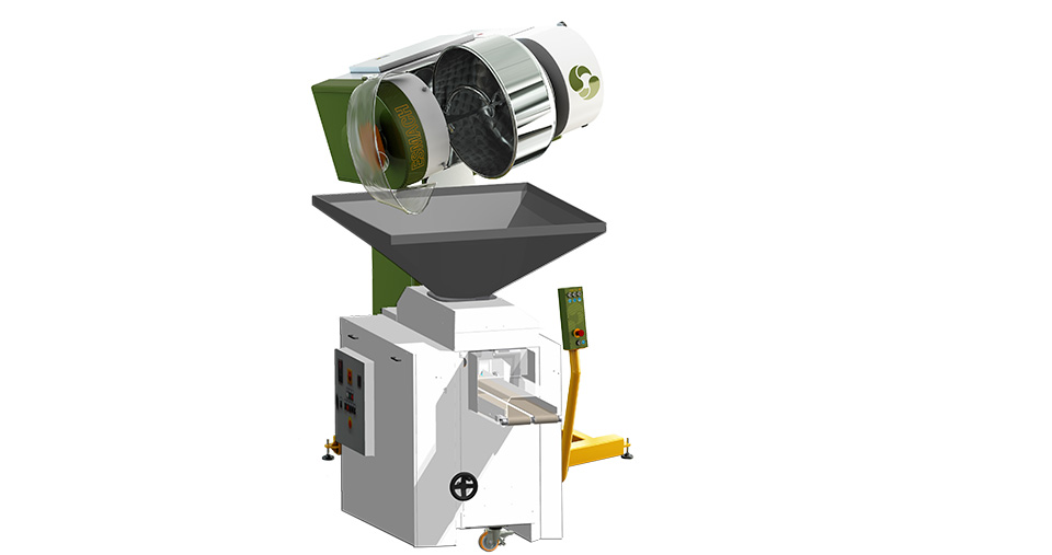 La tramoggia in acciaio inox, disponibile in formato rotondo e rettangolare, è dotata di un dispositivo di sicurezza antinfortuni, collegato elettricamente con la macchina.