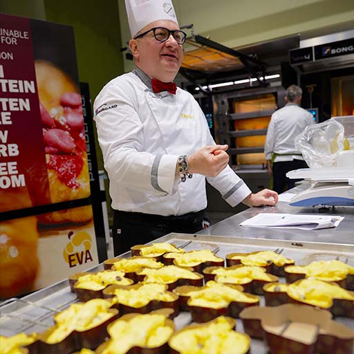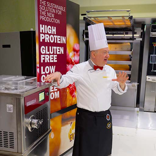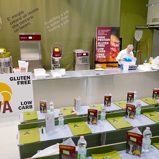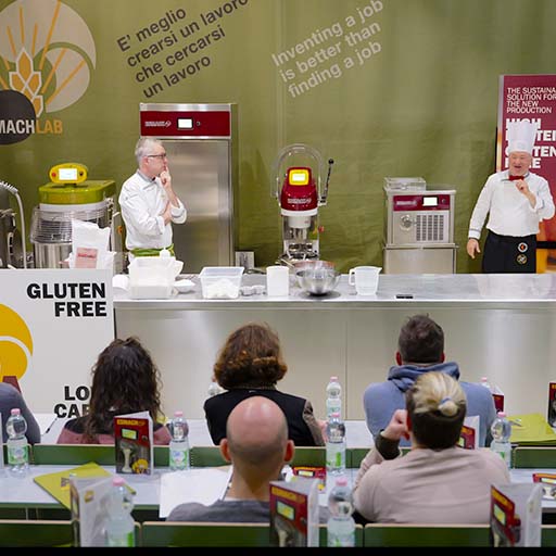 Maestri Francesco Favorito e Stefano Bongiovanni che hanno fatto scoprire a tutti i partecipanti la nuova linea di attrezzature dedicate ai mondi Gluten Free, Free From, High Protein e Low Carb.